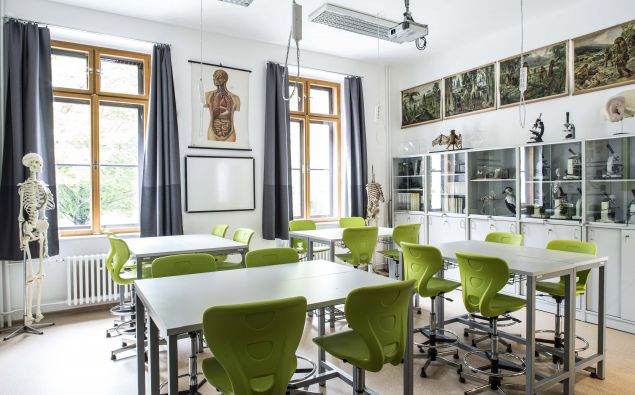 Vybavení gymnázia odpovídá nejvyšším standardům a aktuálním trendům, všichni žáci mají pro výuku odobrných předmětů k dispozici moderně a účelně vybavené učebny, ve škole jsou areály biologie, fyziky, chemie, ICT, cizích jazyků, výtvarné výchovy, které jsou doplněny o laboratoře či praktické učebny, ve škole je velká knihovna, která zároveň slouží jako praktický alternativní výukový prostor, nebo jako studovna a čítárna, pro tělocvik využíváme velkou tělicvičnu s moderním zázemím (sauna, posilovna, nářaďovna, horolezecká stěna aj.), máme k dispozici venkovní výukové prostory (terasa, pergola), škola je bezbariérová, historickou velkou aulu využíváme pro mimořádné příležitosti (přednášky, koncerty, školní rituály apod.).