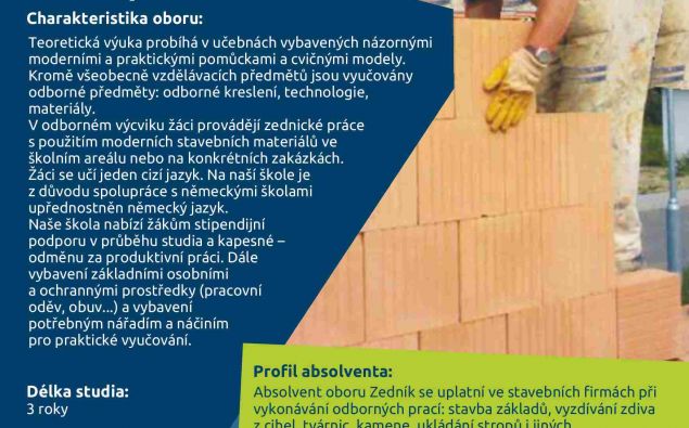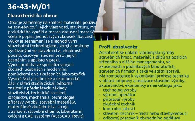 | 36-43-M/01 | Stavební materiály (Technologie a materiály ve stavebnictví) | 4 | Maturitní zkouška | 8 | 4 | 10 | ČJ, M | Denní | Neuvedeno | Ano | |