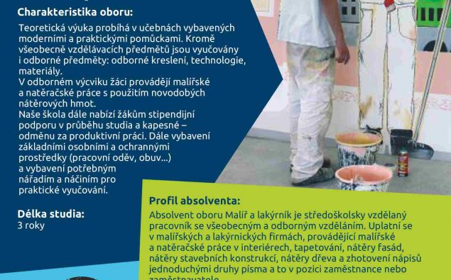 | 39-41-H/01 | Malíř a lakýrník (Malíř) | 3 | ZZ + výuční list | 15 | 6 | 15 | Žádné | Denní | Neuvedeno | Ne | |